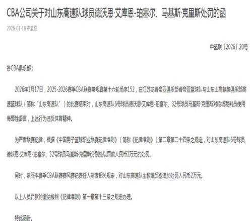 2026年1月17日,2025-2026赛季CBA联赛常规赛第十六轮场序152,在江苏龙肯帝亚俱乐部肯帝亚篮球队与山东山高麒麟俱乐部高速篮球队(简称“山东高速队”)的比赛结束时,山东高速队6号球员德沃恩·艾库恩-珀塞尔、32号球员马基斯·克里斯对临场裁判员使用侮辱性语言,上述行为违反体育精神。